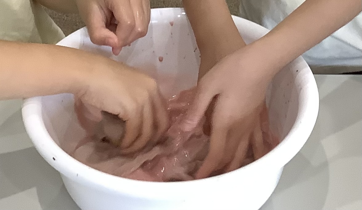 早速児童発達支援のお子様と放課後等デイサービスのお子様の合同で泥染めを行いました。みんな興味津々で、輪ゴムで丸く留めて柄を作ってみたり、スタッフが木工で星を作ってそれをCクランプで固定したりして、2~3分間染料の入った好きな色の洗面器の中で揉みながら染めていきました。