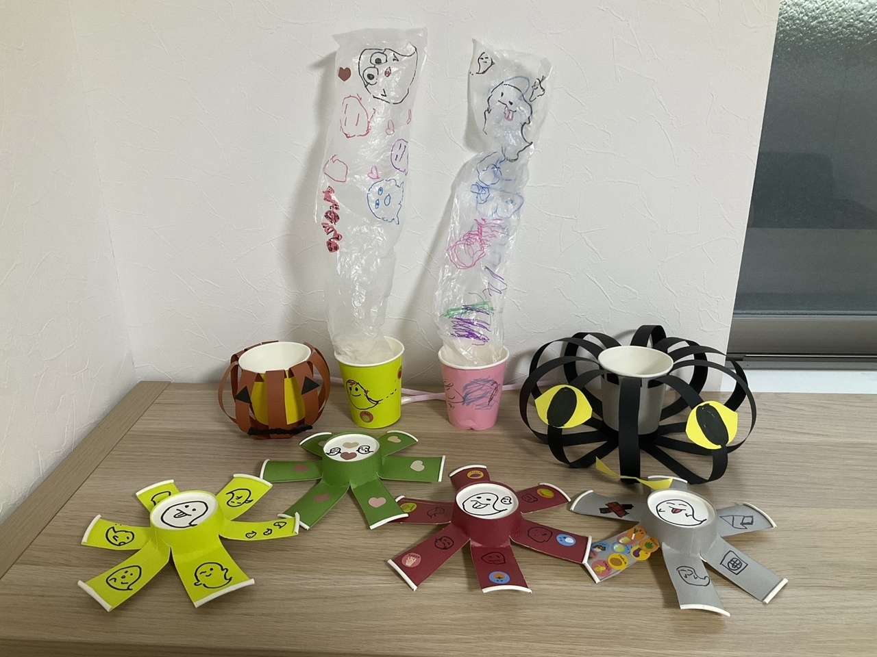 紙コップを使ってハロウィンに因んだ風船おばけやカボチャ、黒ネコ、クルクルおばけが回るコマを作って楽しみました。