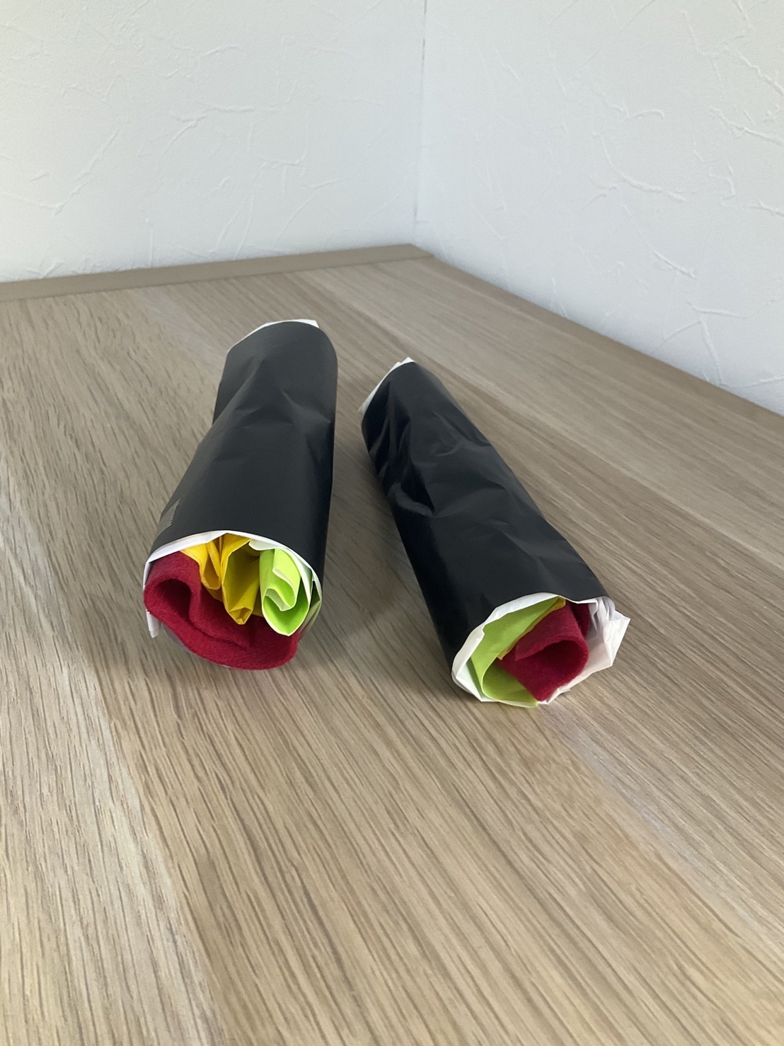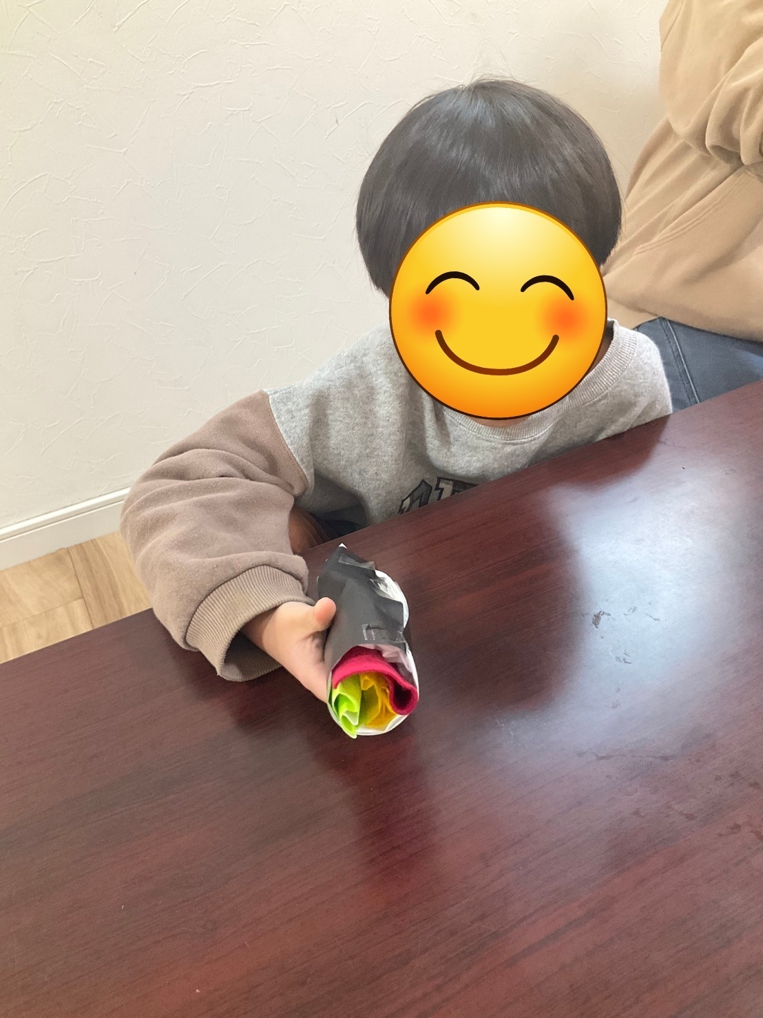 2月は節分の行事に合わせて、制作活動で恵方巻を作りました。今回の制作では紙だけではなく、フェルトやビニールなど様々な感触の素材を使用しました。素材に実施に触れながら、「フワフワしてる」「ツルツルしてる」と感じている姿もみられました。異なる感触を楽しむことは、感覚への気づきを促し、指先の巧緻性や表現力を育てることにもつながります。