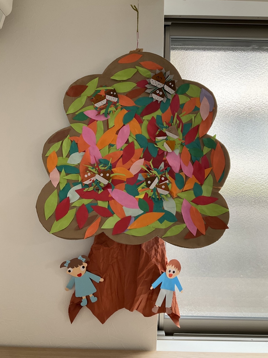 製作活動では、イガグリなど秋らしい作品作りに取り組み、施設内に木を飾りつけ室内があたたかな雰囲気に包まれました。