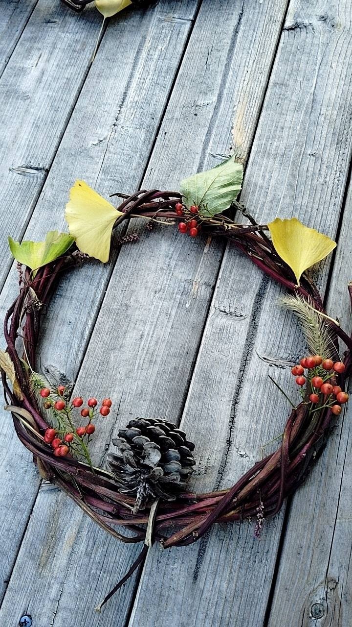 また、サツマイモの蔓を使ってリースの土台を作りました。