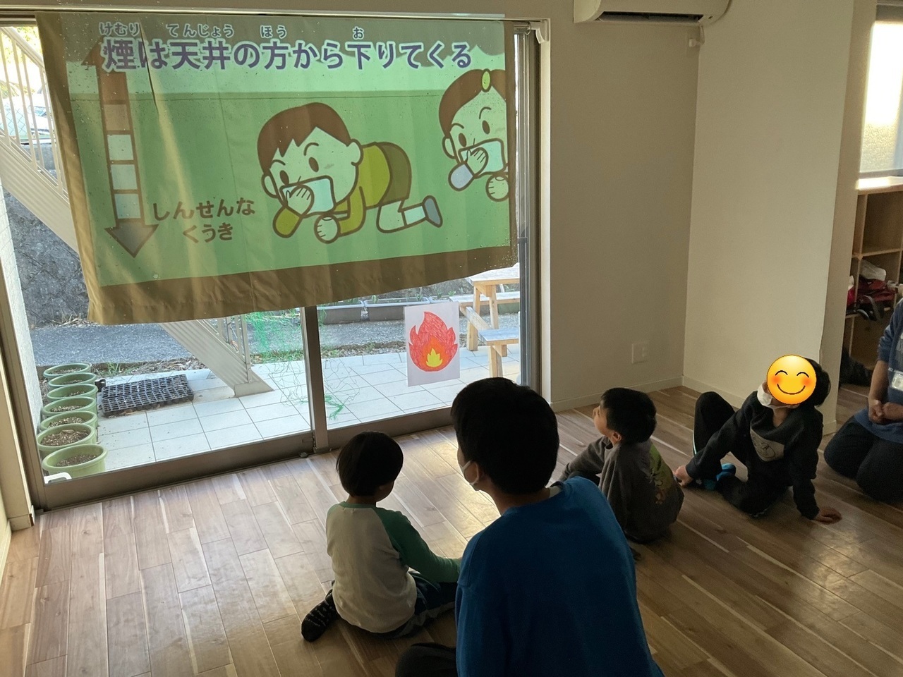 職員は出火場所を確認し、通報する。初期消火をする。子ども達を安全な経路で安全な場所へ誘導するなど、適切な行動が出来るように非常時の手順等の確認もしました。また、安全確保のために個別対応の必要性を強く感じたひとときとなりました。