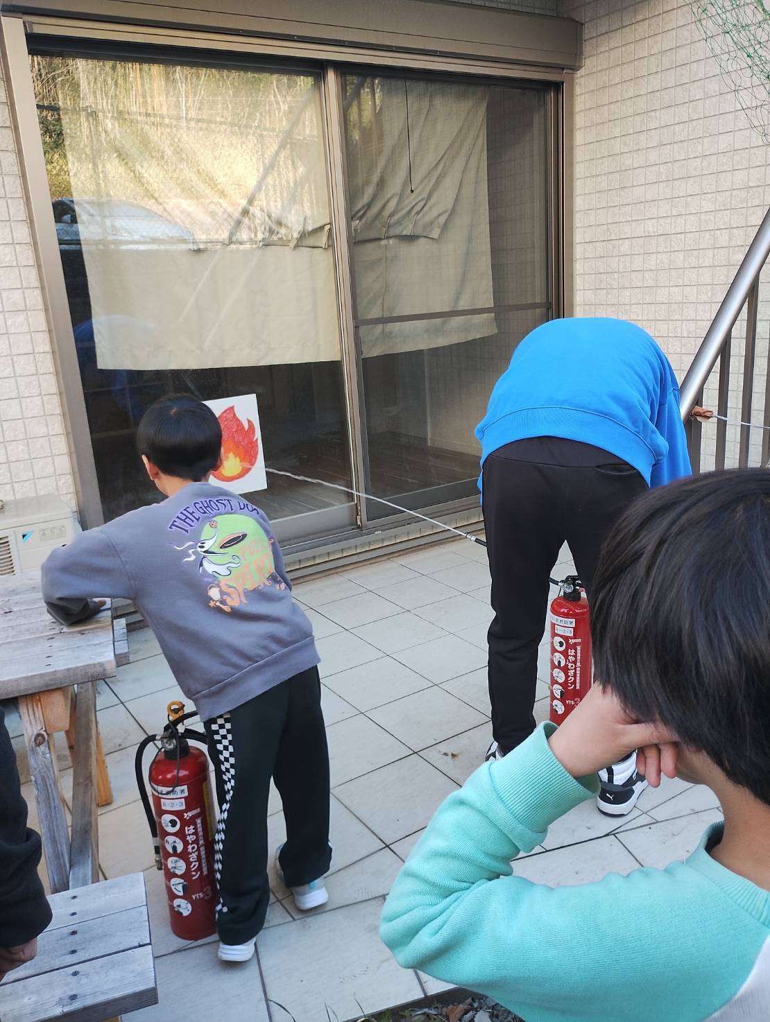 無事、安全な場所へ避難出来た後は、庭へ出て消火器の使い方を学び、初期消火体験をしました。